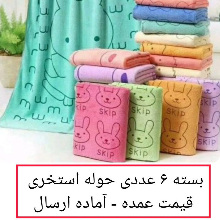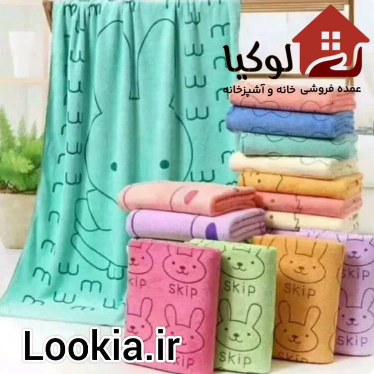 ۶ عدد حوله استخری یک جین حوله حمام و استخر رنگی تولید شده از جنس الیاف میکرو فایبر, ابعاد: 140 * 70 سانتیمتر, عرضه شده در رنگهای صورتی ، نارنجی ، سبز ، زرد ، بنفش ، آبی ، فیروزه ای و شیری , تزئین شده با طرح خرگوش آبگیری بالا و لطیف با همین طرح و جنس در ابعاد 40×40 و 30×30 مناسب خشک کن ظروف و آشپزخانه و 35 × 75 مناسب حوله دست و صورت عمده موجود است پخش یاس تهران